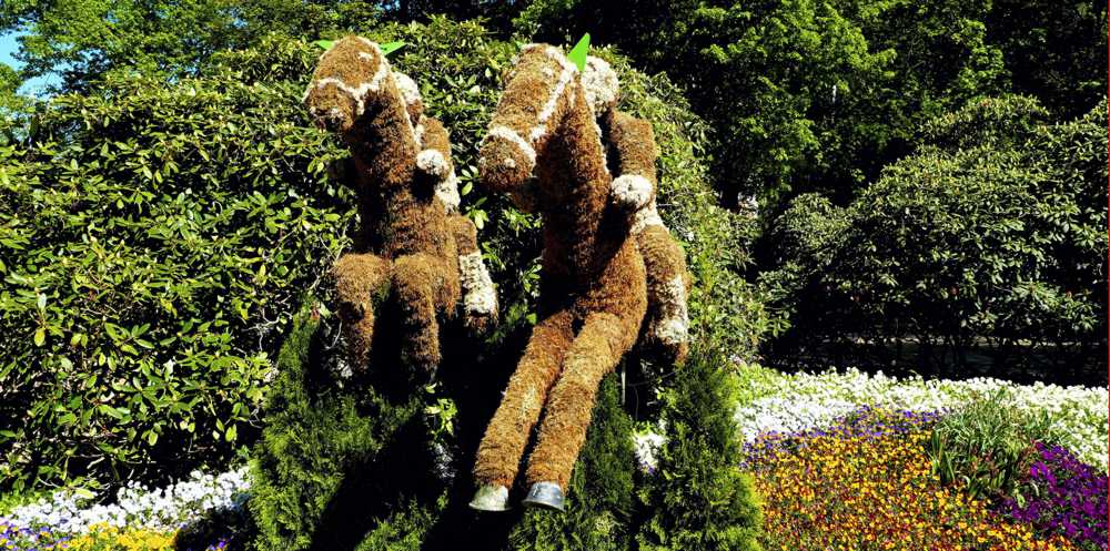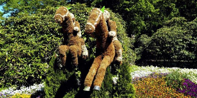 Die Rennpferde springen über eine Hürde durch das blühende Blumenbeet am Karl-Franke-Platz in Bad Harzburg Foto/Text: Helmut Gleuel