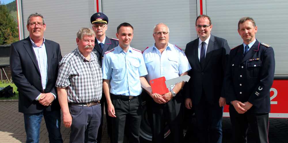 Der Bürgermeister gab den überdimensionalen Schlüssel an den stellvertretenden Stadtbrandmeister und Ortsbrandmeister von Langelsheim Hartmut Ölmann weiter. „Lautenthal besitzt nun das modernste von 18 Einsatzfahrzeugen im Stadtgebiet. Ich muss lange überlegen, bis ich den Schlüssel weitergebe“, so Ölmann mit einem Lächeln. Dank sagte er dem Planungsteam mit Stadtbrandmeister Matthias Brunke, Philip Glomba und Joachim Himstedt. Insgesamt wurden dafür 321 Stunden benötigt. Bereits am 21. Dezember 2015 begann die Grundplanung, dann Baugespräche bei der Herstellerfirma, viele Telefonate wurden geführt und E-Mails geschrieben.