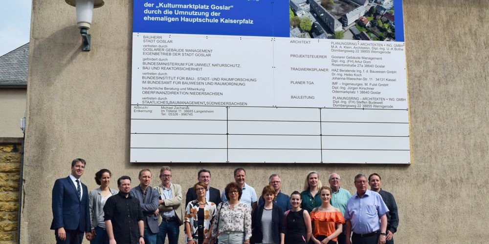 Mit der Enthüllung des Bauschildes haben die Bauarbeiten am Goslarer Kulturmarktplatz offiziell begonnen. Oberbürgermeister Dr. Oliver Junk gab damit heute den Startschuss zu einem weiteren Großprojekt in der Altstadt. Der Umbau der ehemaligen Hauptschule Kaiserpfalz zum neuen Kulturmarktplatz soll insgesamt rund 8,6 Mio. kosten, wobei fast 50 Prozent aus Fördermitteln kommen. Für Oberbürgermeister Dr. Junk ist dies ein ambitioniertes Projekt, das von Beginn an mit enormem Zeitdruck umgesetzt wurde: „Es gibt wohl keine andere Stadt in Deutschland, die gleichzeitig ein Stadtarchiv und eine Bibliothek baut. Für mich ist das ein wichtiges Zeichen im Zeitalter von Handy und Internet“, so Junk.