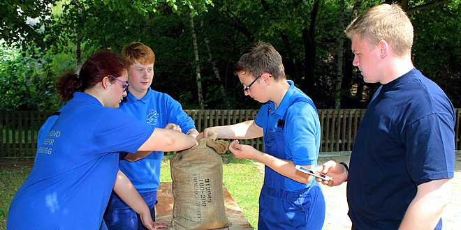 In der vorgegebenen Zeit von fünf Minuten müssen so viele Cent Stücke wie möglich heraus gesiebt werden, das Auskippen war natürlich nicht erlaubt. Am Ausfluss der Granetalsperre, dem Hüttenteich, galt es einen Parcours um eine Insel mit dem Schlauchboot zu absolvieren. Jeweils vier Jugendliche durften die Paddel schwingen.
