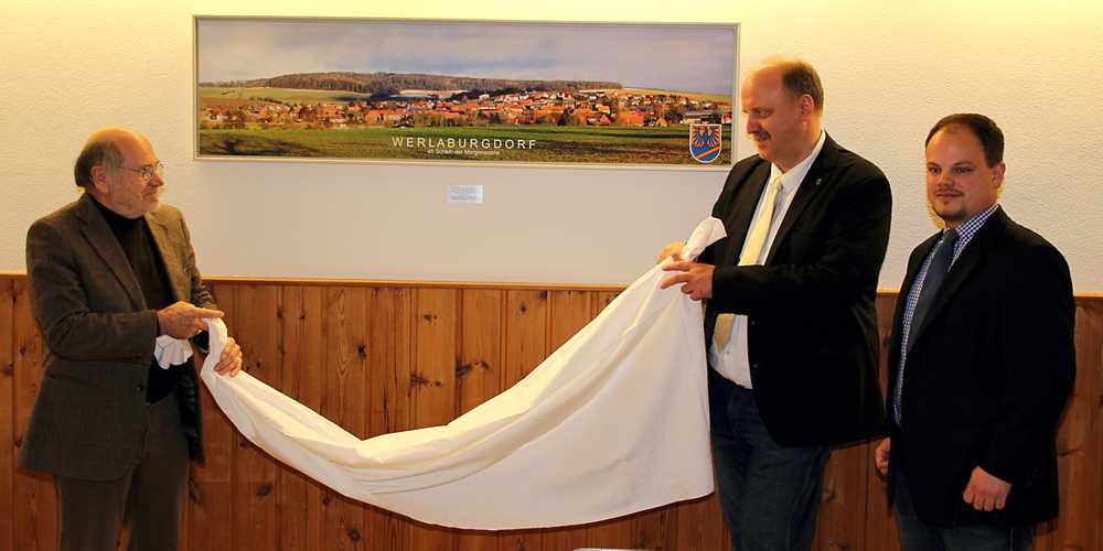 Besondere Ereignisse brauchten besondere Umstände, deshalb hatte Hobbyfotograf Wiechens ein Panoramabild von Werlaburgdorf als Geschenk für das DGH: Die Ansicht im Schein der Morgensonne, aufgenommen von der Kaiserpfalz-Werla aus. Das Bild ist als vertrauensbildende Maßnahme für unsere Einheitsgemeinde zu sehen, es ist alles privat bezahlt worden, Steuergelder wurden nicht verwendet. Das bisherige Ortswappen von Werlaburgdorf wird demnächst darüber angebracht.