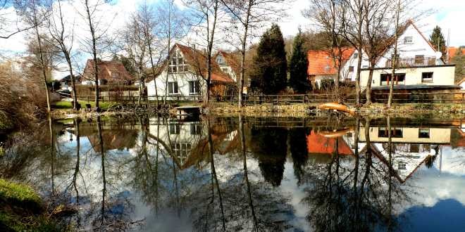 Der am Östlichen Langenberg idyllisch gelegene Dorfteich im Bad Harzburger Stadtteil Schlewecke präsentiert sich im Sonnenlicht als Spiegelbild.