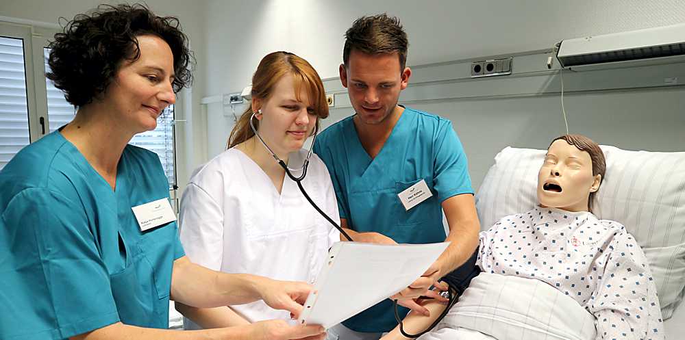 Die beiden Lehrer Chris Köhne und Katja Hunsrügge erklären der Auszubildenden Jaqueline Wilfling die Blutdruckmessung an der Pflegepuppe „Nursing Anne“
