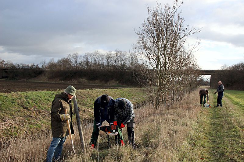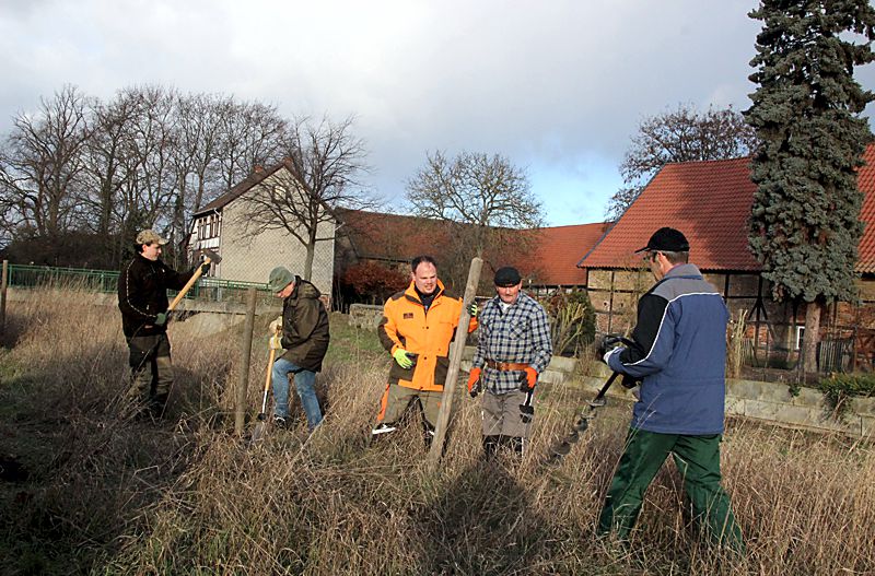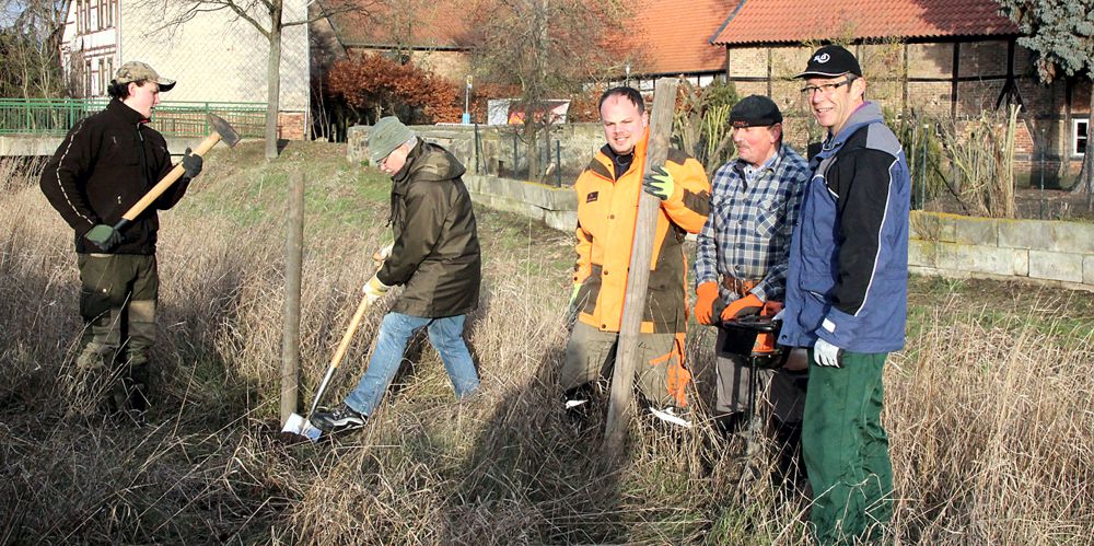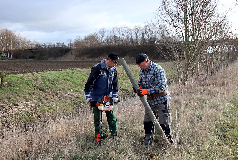 Zehn Ehrenamtliche folgten dem Aufruf, darunter Bürgermeister Tobias Schliephake. Mit einem Erdbohrer wurden die Pflanzlöcher ausgehoben. Mehrere Eschen, Eichen und Weiden wurden gepflanzt und mit einem Pflanzstrick an einem Pfahl befestigt. Alle gesetzten Bäume wurden auch gleich mit Wasser versorgt.