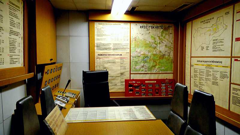 Highlights des Rundganges in der geschichtsträchtigen UTA waren die Besichtigung der im Originalzustand befindlichen, bis 2010 in Betrieb gewesenen Nachrichten- und Dispatcherzentrale (Netzersatzanlage) und das Dienstzimmers des Kommandeurs der geheimen Einheit „Komplexlager II“ der Nationalen Volksarmee (NVA). Die Reservisten und ihre Gäste zeigten sich von der DDR-Bunkertechnik und den Ausstattungsgegenständen im Dienstzimmer, wie z. B. das Mobiliar und verschiedene an den Wänden angebrachte Karten und Pläne, die sich unverändert in dem kleinen unterirdischen Raum befinden, beeindruckt.