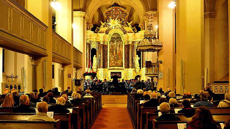 Nach einführenden Worten des Dirigenten brachte das 40-köpfige ehrenamtliche Orchester mit Pauken, Trompeten sowie Flöten, Klarinetten, Saxophonen und weiteren Instrumenten weitere Musikstücke, so unter anderem die Kirchliche Festouvertüre über den Choral Ein feste Burg ist unser Gott zu Gehör.