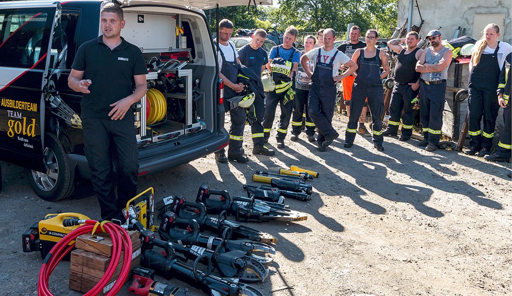 Gemeindewehrleiter Enrico Mäntz lud zu einer Präsentation neuster hydraulischer Rettungsgeräte und Geräte zur technischen Hilfeleistung von Weber Rescue ein.