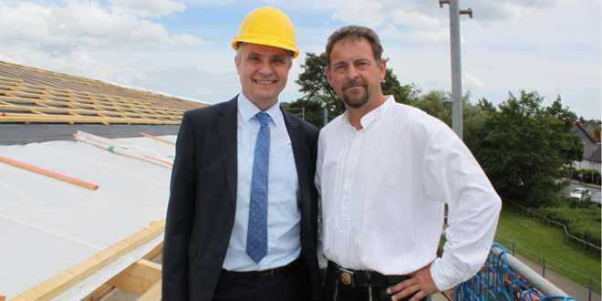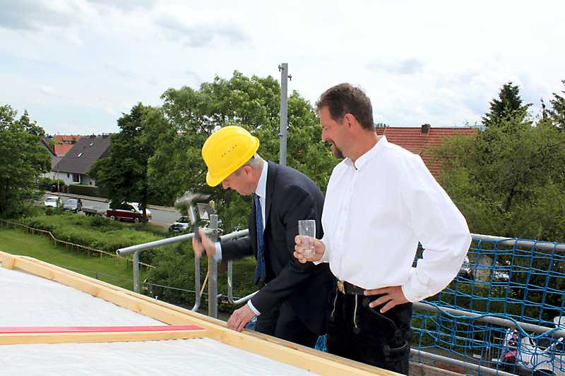 Landrat Thomas Brych – der unter dem prüfenden Blick von Zimmermeister Maik Krüger (Firma Eggert) den letzten Nagel einschlug zeigte sich erfreut über den Baufortschritt, erklärte jedoch auch, dass es aufgrund einer längeren Kälteperiode zu Beginn des Jahres zu Verzögerungen auf der Baustelle gekommen ist. „Aufgrund schlechter Witte-rungsbedingungen mussten die Gründungsarbeiten für einen Zeitraum von rund acht Wochen ruhen, so dass erst Anfang März die restlichen Fundamente und die Sohlplatte betoniert werden konnten“, so Landrat Thomas Brych.