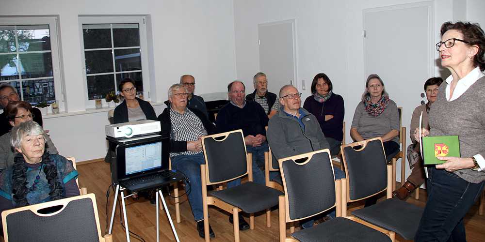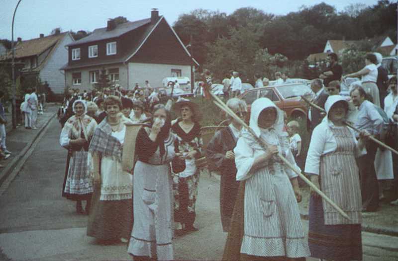 Ortsheimpflegerin Dagmar Mönnecke-Koroma hatte die gutbesuchte Veranstaltung im Gemeinderaum der Kirche organisiert. Begleitet wurde der Abend durch eine Diashow, besonders vom Jubiläumsumzug mit Bildern von Horst Nause. So konnten sich die Teilnehmer selbst oder auch ihre Vorfahren in Wort und Bild, oft mit einem Lächeln im Gesicht, erleben. Zahlreiche bunte Umzugswagen, u.a. von der Wäscherei Ilse Bock und von der Landwirtschaft waren zu sehen, ebenso der Fanfarenzug und viele Vereine.