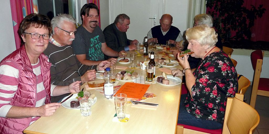 Vier Tage vor dem Schlachtefest hatten einige Kolpingbrüder bei einem Hausschlachter über 150 Kilogramm Fleisch für Wurst im Darm und in Dosen verarbeitet. Angeboten wurde eine Schlachteplatte, die mit Mett, Sülze, Knackwurst, Leberwurst und Rotwurst bestückt war.