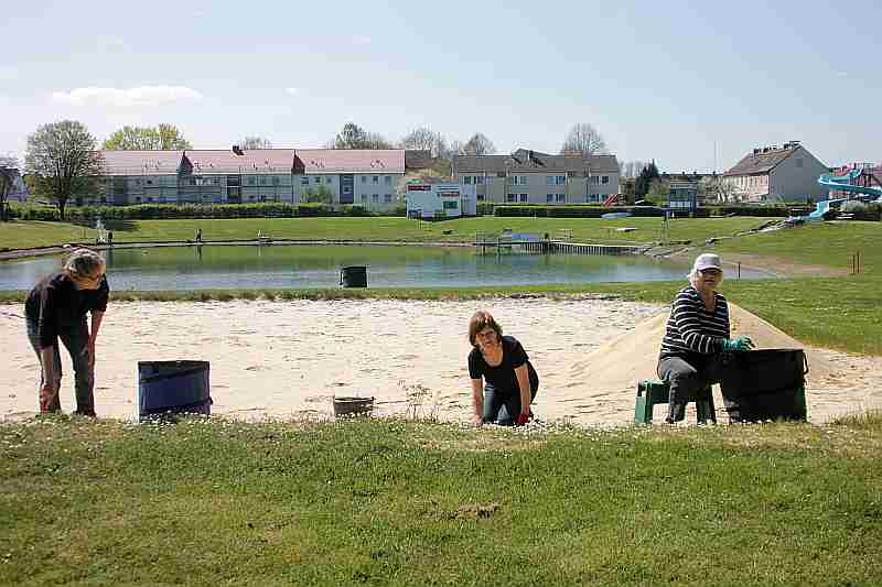 Arbeit gab es reichlich. Vorstandsmitglied Werner Schleifer, verantwortlich für die Organisation und Einteilung des Einsatzes, zeigte sich erfreut, dass doch so viele Helfer/Innen dem Aufruf gefolgt waren und hatte viele Aufgaben, die zu erledigen waren. Einige Aktive hatten bereits im Vorfeld viele Arbeiten ausgeführt, bzw. vorbereitet. Um die Aufgaben einmal beim Namen zu nennen, ging es dabei um Unkrautbeseitigung im Bereich der Uferzone des gesamten Strandes, sowie des Volleyball- und des Beachsoccer Feldes, das Reinigen der Mutter-Kind-Anlage und des Nichtschwimmerbeckens. Des weiteren wurden Volleyball- sowie Soccerfeld und der Strandbereich mit einer EGGE aufgelockert. Markisen wurden angebaut, Schaukel und Wipptiere einsatzbereit gemacht. Die Bodenumrandung des Badaufsichtshäuschens wurde erneuert. Sanitäranlagen wieder für die Saison vorbereitet. Auch im Eingansbereiches vom Schwimmbad, säuberten fleißige Hände den Parkplatz und brachten die bepflanzten Beete auf Vordermann. Kaffee und