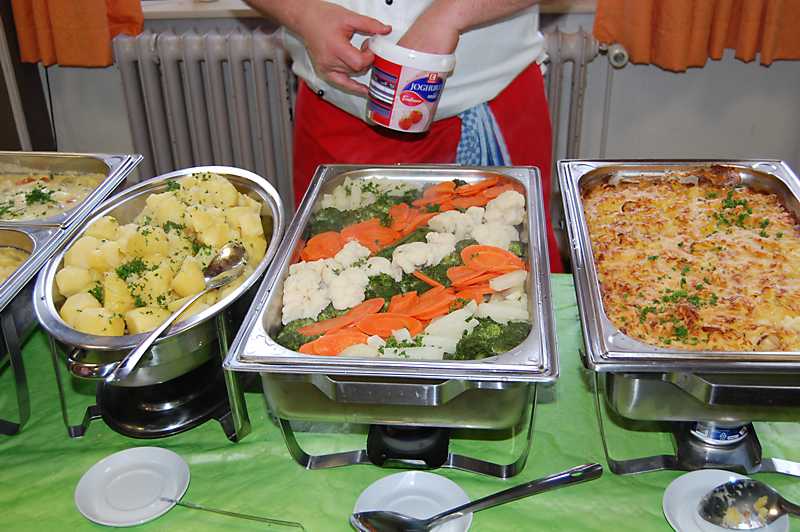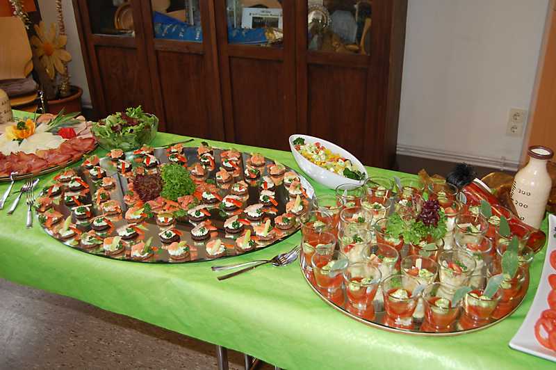 Anschließend wechselten wir zu den vielfältigen Hauptspeisen: Polenta, gratinierten, gekochten und gebratenen Kartoffeln, Schweine- und Hähnchenschnitzel, Schweinefilet mit leckerer Soße, Putengeschnetzeltes, Spargel und Spargelragout, gemischtes Gemüse. Es schmeckte wieder hervorragend. Die letzte Lücke im Bauch wurde zum Schluss mit den köstlichen Nachspeisen gefüllt. Frisches Obst und in kleine Gläser portionierte Puddings und rote Grütze rundeten das Ganze ab.