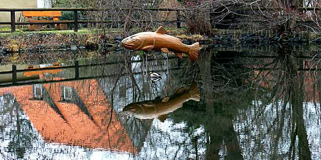 Der Stockente im Spiegelbild der Forelle macht das trübe und kalte Wetter nichts aus. Sie genießt die Ruhe auf dem idyllisch gelegenen Dorfteich im Bad Harzburger Ortsteil Schlewecke. Helmut Gleuel