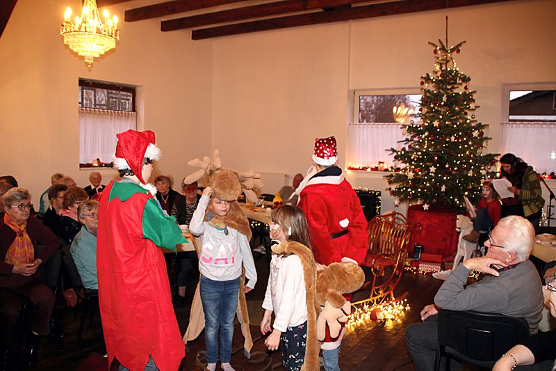 Ein kleines Theaterstück Wie der Weihnachtsmann zu seinem Schlitten kam, führten neun Kinder vom Regenbogenhof auf. Zusammen sang man in Begleitung von Sabine und Susanne auf der Gitarre noch die Weihnachtslieder Fröhliche Weihnacht überall, Tragt in die Welt nun ein Lied und Süßer die Glocken nie klingen.