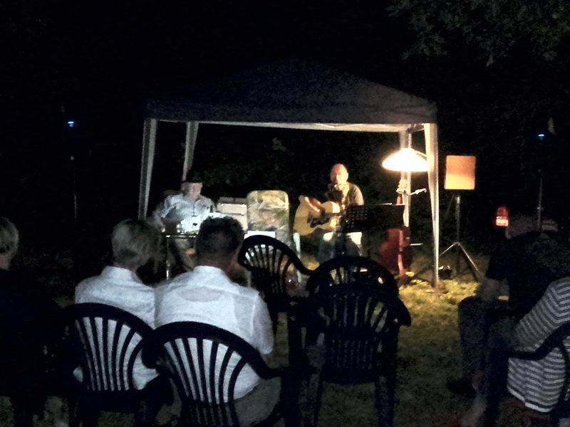 Dann schloss sich zu fortgeschrittener Stunde im lauen Sommerabend ein Konzert mit zarten Gitarrenklängen von Günter Scholz an. Wie schon im vergangenen Jahr begeisterte der Folksänger die Gäste mit Stimme und Gitarre. Er ließ Evergreens der 60er und 70er erklingen, was viele Gäste an ihre Jugend erinnerte. Zwischen den Liedstücken gab Jochen Buchholz Anekdoten und Geschichten aus dem Leben von Wilhelm Busch zum Besten. Natürlich auch Max und Moritz, was die Gäste mit viel Applaus belohnten.