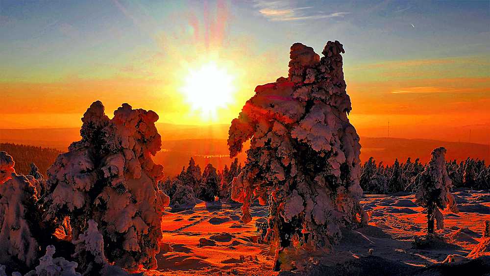 Es zeigt den Sonnenuntergang vom Standort Brocken. Am rechten Bildrand ist der Ort Torfhaus zu sehen.