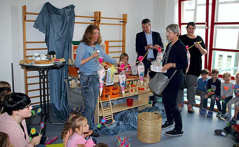 Den Kindergarten besuchen 63 Kinder, aufgeteilt in zwei Regelgruppen und eine Integrationsgruppe. Traditionell hingen an einer langen Leine zehn 100 Euro-Scheine mit entsprechenden süßen Überraschungen dazwischen. Oberbürgermeister Dr. Oliver Junk, Fachdienstleiterin Karin Jünke als Vertretung für den Kindergarten und die stellvertretende Leiterin Anja Deisl nahmen gemeinsam mit vielen Kindern freudig die Spende entgegen. Für die Spende werden zwei Kindertische und Kindersitzbänke für den Außenbereich angeschafft.