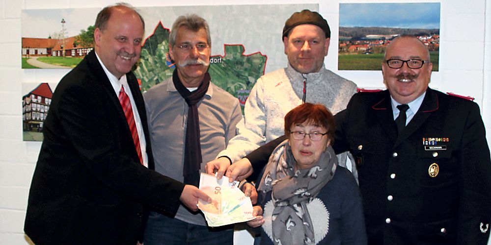 Der Erlös stammt von der traditionellen Glühweinparty, die immer eine Woche vor Weihnachten vor der alten Schule veranstaltet wird. Der Bürgermeister der Gemeinde Schladen-Werla, Andreas Memmert, nahm das Geld vom Organisator Heinrich Weidemann, der Ortsbeauftragten Sieglinde Oellerich, dem Ortsbrandmeister Dierck Beckmann und Sascha Hain von den Eckerlöwen entgegen.