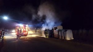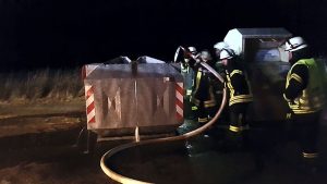 Auch am Mittwochabend rief die Sirene die Hornburger Feuerwehr wieder zum Einsatz. Ebenfalls ein brennender Müllcontainer. Diesmal im Hopfenweg in der Nähe vom Bauhof. Hier bekämpfte man den Brand unter Einsatz von schwerem Atemschutz mit zwei Trupps und baute eine Wasserleitung zum Tanklöschfahrzeug auf. Nach rund einer Stunde konnte man die Einsatzstelle der Polizei übergeben und wieder einrücken.