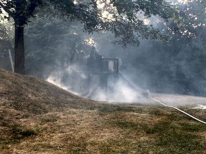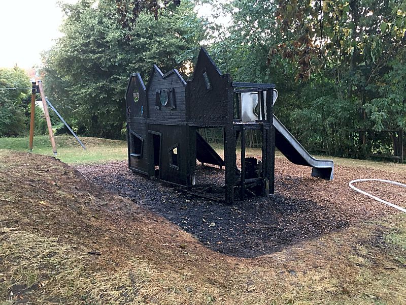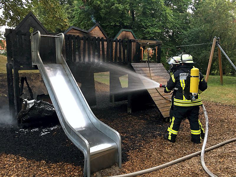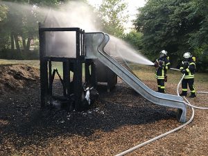 Etwas länger dauerte hingegen der Einsatz am 12.07.2018. Erneut gab es um 20.45 Uhr einen gemeldeten Brand. Dieses Mal allerdings im Lilienweg auf dem Abenteuerspielplatz, wo ein Klettergerüst im Flammen stand. Die Feuerwehrkameraden bauten eine Wasserleitung zum Tanklöschfahrzeug auf und fingen unter schwerem Atemschutz an den Brand zu löschen. Durch die hohen Flammen drohten die umliegenden Bäume Feuer zu fangen. Nachdem dann um kurz nach 22.00 Uhr noch weitere potenzielle Brandorte (Container, Spielplätze) vorsorglich kontrolliert und geflutet wurden, konnte die Hornburger Wehr den Einsatz beenden.