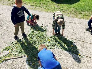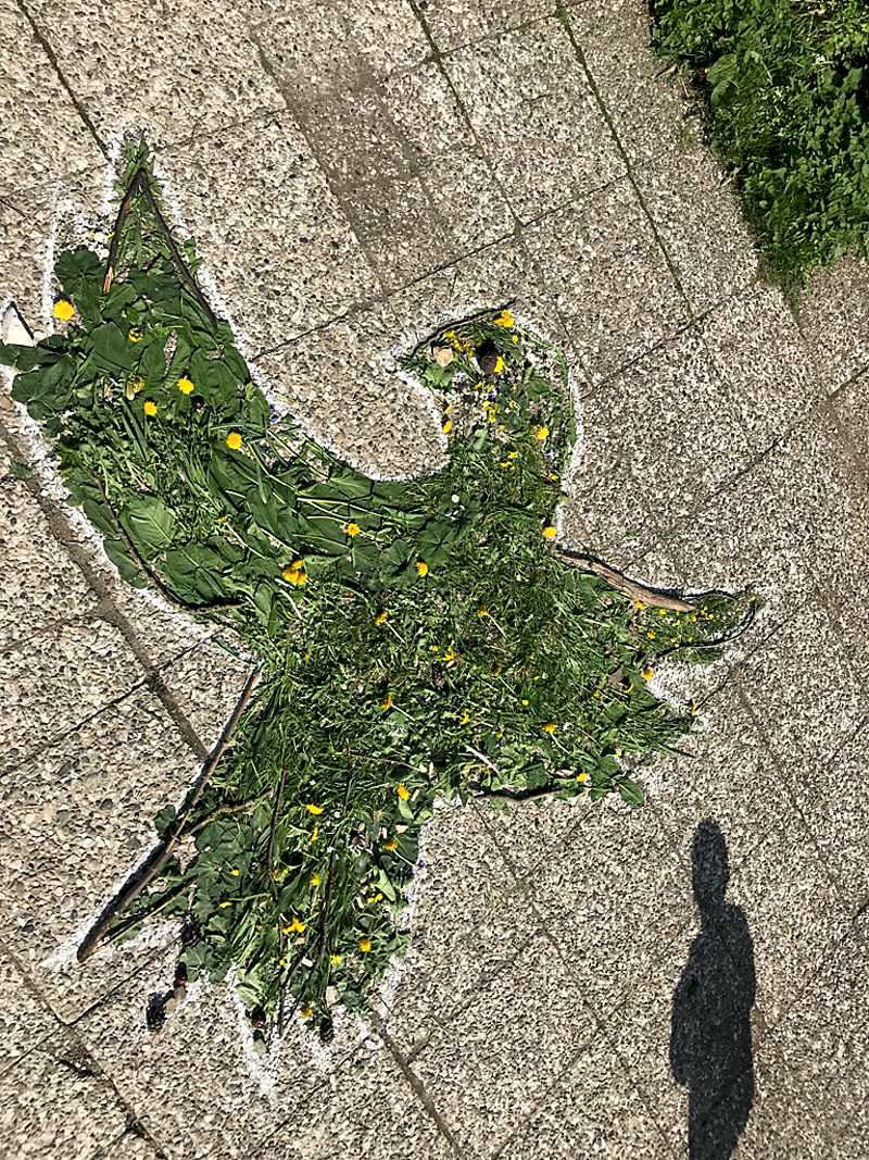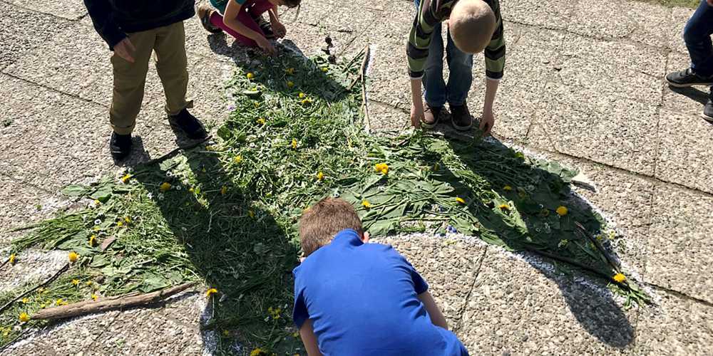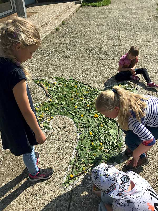 Die Kinder der Grundschule Worthschule haben passend zu Pfingsten eine Taube aus Blüten und Gräsern auf den Schulhof gelegt