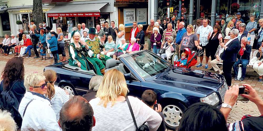 Der traditionelle Salzfestumzug führte bei herrlichem Wetter vom Schlosspark durch die Innenstadt zum oberen Badepark. Es nahmen rund 40 Gruppen von Vereinen und Organisationen teil. An der Zugspitze marschierte Bürgermeister Ralf Abrahms froh gelaunt und mit einem Fächer in der Hand vor dem Wagen von Herzog Julius und Gemahlin.