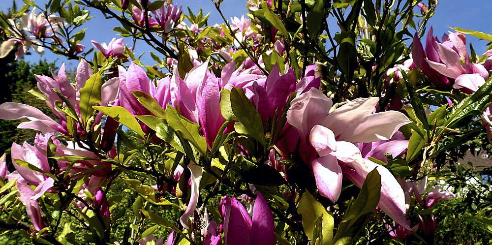 Die Magnolien erfreuen uns schon mehrere Wochen mit traumhaft bunten Blüten Abgefallene Blüten werden schnell ersetzt. Magnolienbäume sind durch ihre Blütenpracht Farbtupfer in vielen Gärten und Parkanlagen. Foto/Text: Helmut Gleuel