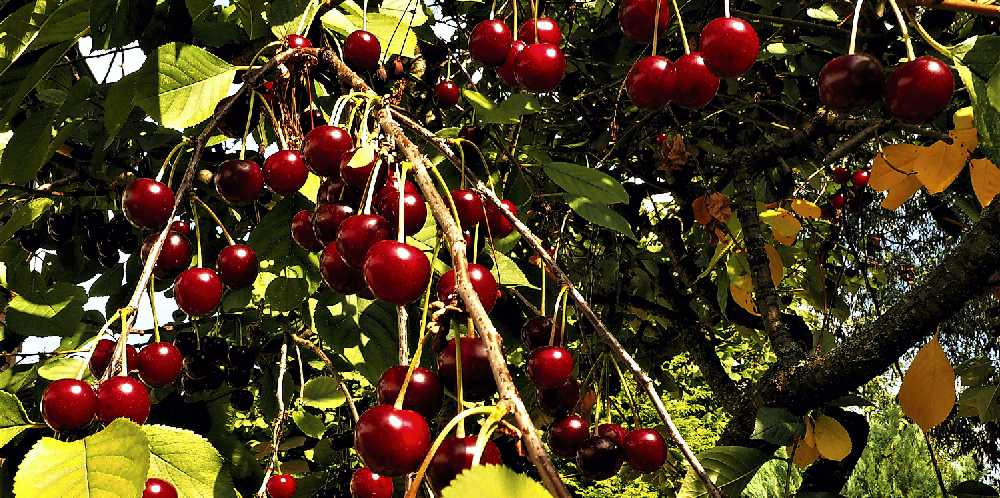 Durch die schon lange andauernde Trockenzeit werden nicht nur die Rasenflächen, sondern auch Blätter des Kirschbaumes bereits gelb, obwohl die Früchte noch nicht reif sind.