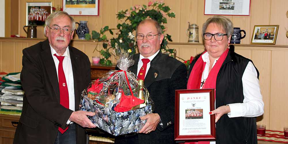 Mehlau hatte dem Chor vorzeitig mitgeteilt, dass er am Ende des Jahres den Stab abgeben möchte. Die 2. Vorsitzende Gabriele Hauck überreichte einen Präsentkorb und ein Bild vom Chor. „Wir sind alle sehr traurig und wissen, was wir an dir hatten. Das Bild kannst du in dein Wohnzimmer hängen, dann kannst du immer an uns denken“, so Gabriele Hauck.