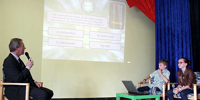 Matthias Bolm ermunterte die Kindergartenkinder und die erste Klasse, die Hühnerpolonaise mit zu tanzen. Das Kollegium und die Kinder hatten sich etwas Besonderes einfallen lassen, sie spielten mit ihrem Rektor „Wer wird Millionär?“ Sie stellen Fragen wie: In welcher Reihenfolge arbeiteten Sie an der Schule? Welches Gerät bringt Sie regelmäßig auf die Palme? Wie alt sind alle Schüler an unserer Schule zusammen? Welche Melodie gehört für Sie standartmäßig zum Sonntagvormittag? Und einige mehr. Alle 15 Fragen wurden richtig beantwortet, sogar der Telefonjoker und die Publikumsfrage waren richtig und die „Million“ wurde ihm mit einem gefüllten Präsentkorb ausgezahlt. Passend dazu ließen die Kinder wie in der Fernsehsendung viele Luftschlangen fallen.
