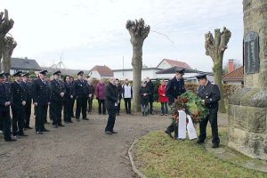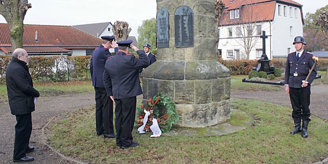 Dort legten Ortbrandmeister Frank Rother und sein Stellvertreter Hans-Joachim Callies einen Kranz am Ehrenmal nieder. Die Ehrenwache mit Fackeln hielten die Feuerwehrmänner Christian Heinemeyer und Björn Kammeier. Der Ortsbürgermeister von Schladen-Werla, Heinz-Jürgen Wiechens, hielt die Gedenkrede zum Volkstrauertag.