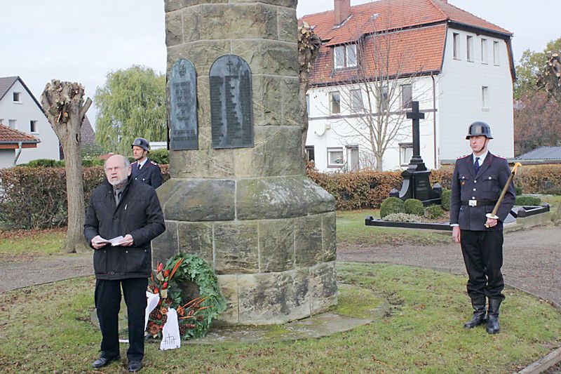 „Der Volkstrauertag ist ein stiller Gedenktag. Er ist ein Tag der Trauer um Menschen, die Unfassbares erleben mussten. Gedenken ist jedoch nicht nur auf die Vergangenheit gerichtet. Gedenken bezieht sich auch auf die Gegenwart, denn Krieg, Gewalt, Terror und Verfolgung bestimmen nicht nur die Vergangenheit, sie haben uns hier in Europa nach mehr als 70-jähriger Friedenszeit eingeholt. Nach Angaben des Flüchtlingswerkes der Vereinten Nation waren 2015 mehr als 65 Millionen Menschen auf der Flucht vor Tod und Terror. Die globale Flüchtlingskriese hat auch hier in der Gemeinde Schladen-Werla ein Gesicht bekommen. Rund 140 Schutzsuchende haben wir in den vergangenen Monaten aufgenommen. Menschen, die vor Krieg und gewaltsamen Übergriffen aus ihrer Heimat geflohen sind. Wir sollten daher den Volkstrauertag als Einladung zum Nachdenken darüber nutzen, was die unzähligen Kriegstoten und Gewaltopfer, derer wir am Volkstrauertag gedenken, uns für die Jetztzeit lehren können“, so der Ortsbürgermeister.