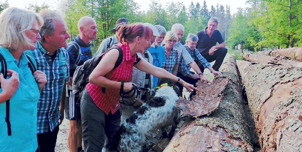 Bei einer Rundwanderung um Königskrug konnte Frau Bauling alle aktuellen Stadien der Waldentwicklung am Objekt thematisieren und viele Fragen beantworten. Die Bandbreite reichte von entnommenen Fichten über frisch abgestorbene Fichten bis zu bereits wieder mit jungen Bäumen bestandenen Flächen, die die Walddynamik eindrucksvoll wiederspiegeln. Dabei wurden auch Fraßbilder des Buchdruckers, des nur wenige Millimeter großen Borkenkäfers, der maßgeblich am Absterben der Fichten beteiligt ist, gezeigt und seine Entwicklungszyklen thematisiert. Dabei waren die vom Nationalpark fotografierten Zeitreihen der Waldentwicklung an verschiedenen Stellen, z.B. am Bruchberg bei Altenau, eine instruktive Hilfe – zeigen sie doch, wie zügig sich der Wald von selbst „repariert“ und in einem dauerhaften Waldkreislauf von der Totholzphase wieder zur Verjüngung übergeht.
