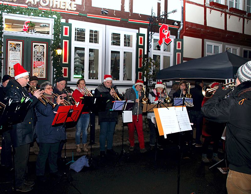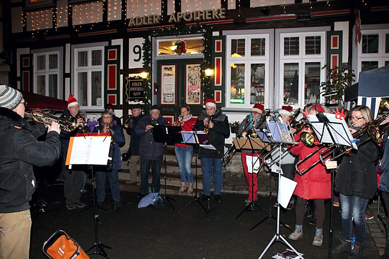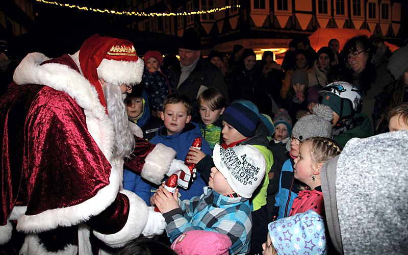 Der kam dann pünktlich mit seiner Wichtelin als Gehilfin. Bevor die Weihnachtsmänner verteilt wurden, sangen die Kinder „In der Weihnachtsbäckerei“ und „O, Tannenbaum“. Zwei Geldinstitute hatten 180 Weihnachtsmänner gesponsert. Das Rahmenprogramm begann am Nachmittag in der evangelischen Kirche mit einem offenen gemeinsamen Winter- und Weihnachtsliedersingen. Der Schulchor der Clemens Grundschule Hornburg unter der Leitung von Tomke Warner-Kosel sang auf der Treppe der Adler Apotheke „Jesus ist geboren“ und „Das Lied von der Weihnachtsmaus“. Stolz war die Flötengruppe mit ihrem ersten öffentlichen Auftritt, sie spielten „Morgen kommt der Weihnachtsmann“.