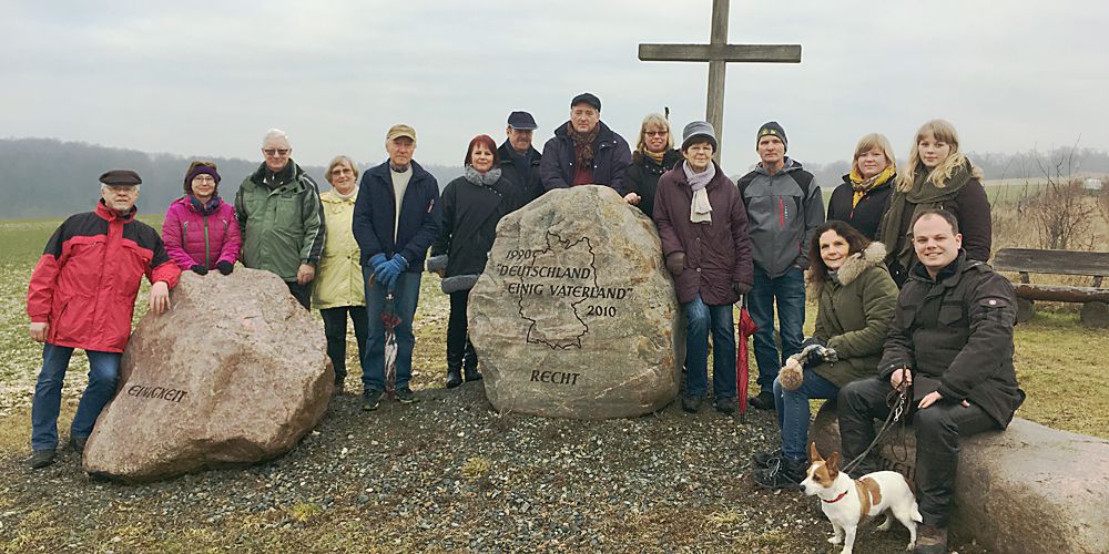 Eine kurze Pause machten die Teilnehmer der CDU-Braunkohlwanderung am Denkmal zum Tag der Deutschen Einheit. Bei klarem Wetter bietet sich hier eine herrliche Sicht auf den Harz und das Umland.