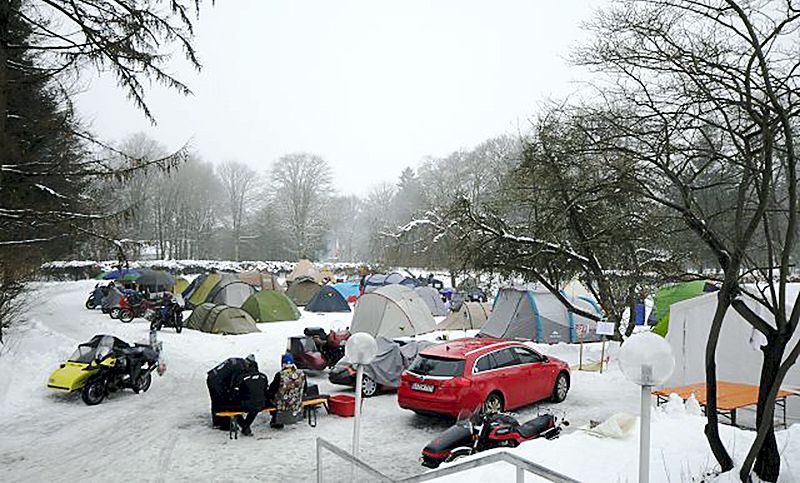 Eintreffen ist eigentlich ab Donnerstag, der erste Teilnehmer war wie üblich bereits am Mittwoch da. Am Donnerstagabend trafen sich die Früheintreffer zum gemütlichen Plaudern im Stammlokal. Schnee war ausreichen da, die Zeltwiese wurde von den Städtischen Betrieben wieder gewalzt, so dass alle prima zelten konnten. Bis Freitagnachmittag trafen 54 Teilnehmer ein.