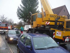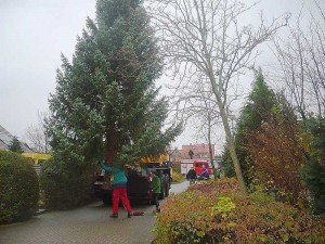 Am Samstag den 28.11.2015 war es wieder soweit. Die Strohbärgruppe hat den Weihnachtsbaum aufgestellt. Leider war das Wetter sehr nasskalt und erschwerte die Arbeiten. Die ca. 15 Jahre alte Tanne wurde in diesem Jahr von der Familie Müller gespendet. Eine Vienenburger Baggerfirma sorgte mit einem Autokran für den reibungslosen Abtransport, der von der Freiwilligen Feuerwehr Wiedelah mit Absicherungsmaßnahmen begleitet wurde. Zuerst wurde der Baum in der Silcherstraße an einem Kranseil gesichert. Die unteren Äste wurden beseitigt bevor die Kettensäge zum Einsatz kam. Dann kam der Einsatz des Autokranes, der den Baum aus dem Garten auf die Straße hievte.