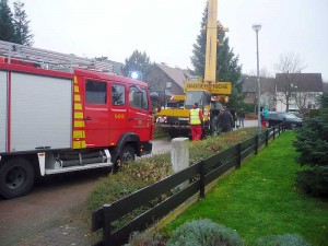 Jetzt begann der vorsichtige Abtransport aus der Silcherstraße. Da diese Straße sehr kurvig und mit Bäumen bewachsen ist, musste Jürgen Friehe viel Fingerspitzengefühl aufwenden, um keine Schäden zu verursachen. Dann ging die Fahrt über die Wülperoder Straße weiter. Die Feuerwehr sperrte einige Straßen ab und fuhr dem Transport voraus.
