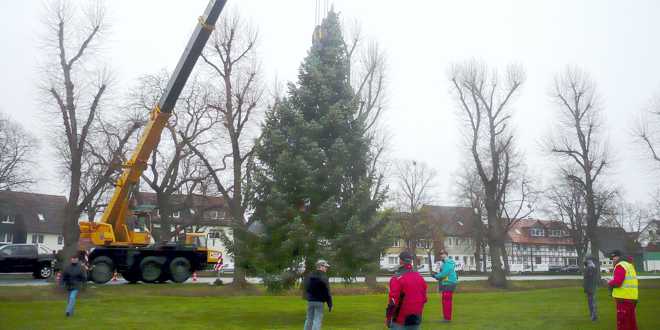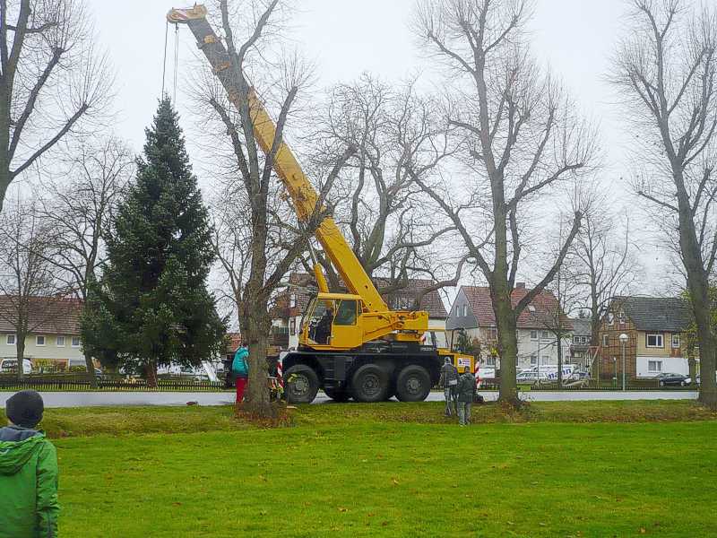 Wegen des feuchten Wetters und den Erfahrungen aus dem Vorjahr fuhr der Autokran nicht auf den Marktplatz sondern plazierte sich auf der Amtstraße. Nun musste der Ausleger ganz ausgefahren werden, um den Weihnachtsbaum zwischen den Linden hindurch auf den Marktplatz zu heben. Weder eine Linde noch der Weihnachtsbaum wurden beschädigt. Alle Mitwirkenden haben über diese bravouröse Leistung gestaunt.