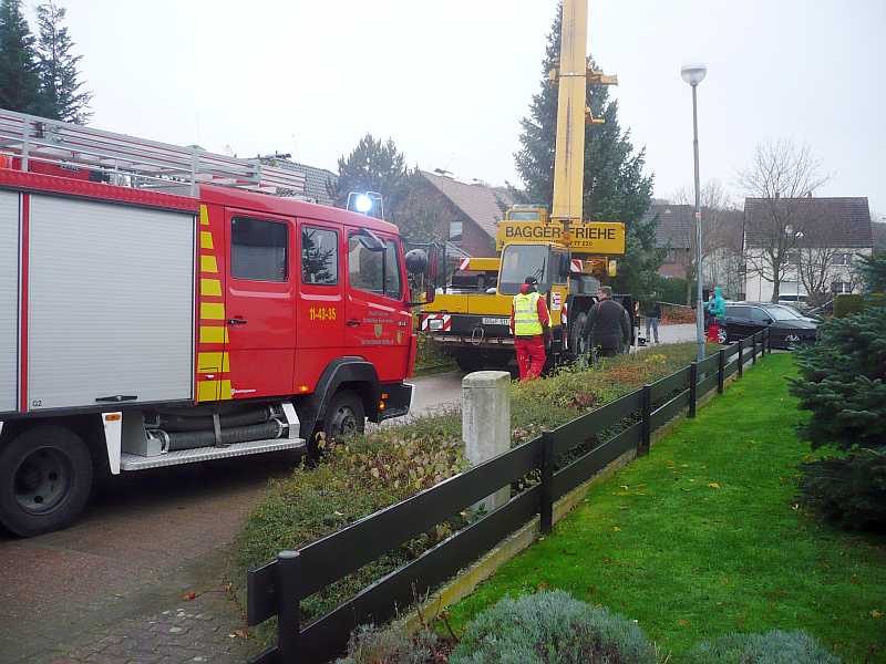 Am Samstag den 28.11.2015 war es wieder soweit. Die Strohbärgruppe hat den Weihnachtsbaum aufgestellt. Leider war das Wetter sehr nasskalt und erschwerte die Arbeiten. Die ca. 15 Jahre alte Tanne wurde in diesem Jahr von der Familie Müller gespendet. Eine Vienenburger Baggerfirma sorgte mit einem Autokran für den reibungslosen Abtransport, der von der Freiwilligen Feuerwehr Wiedelah mit Absicherungsmaßnahmen begleitet wurde. Zuerst wurde der Baum in der Silcherstraße an einem Kranseil gesichert. Die unteren Äste wurden beseitigt bevor die Kettensäge zum Einsatz kam. Dann kam der Einsatz des Autokranes, der den Baum aus dem Garten auf die Straße hievte.