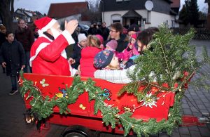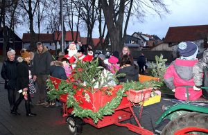Am späten Nachmittag kam auch der Weihnachtsmann, er hatte auf dem Anhänger eines Lanz, Baujahr 1956 mit 12 PS, Platz genommen. Der Besitzer des historischen Treckers, Benno Zadlovski, unternahm mit den Kindern den ganzen Tag Rundfahrten durch das Dorf.