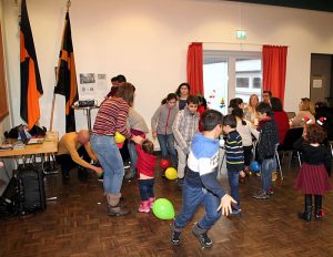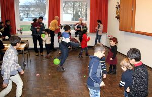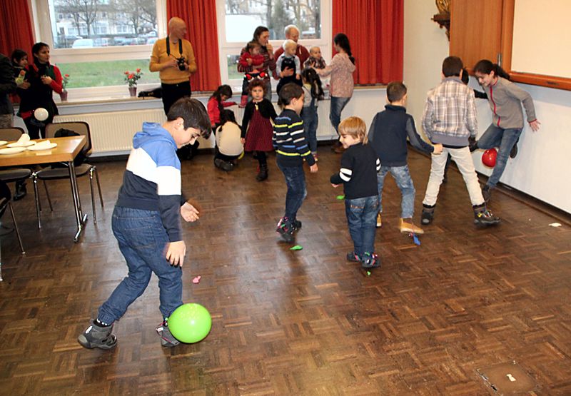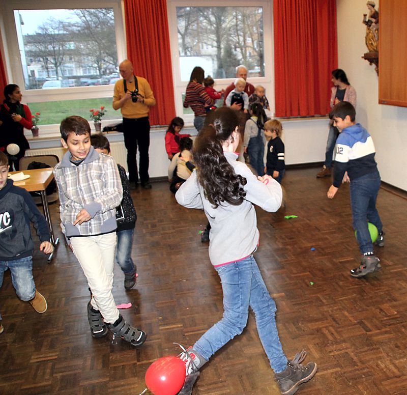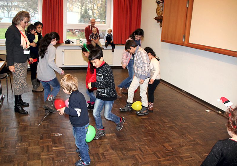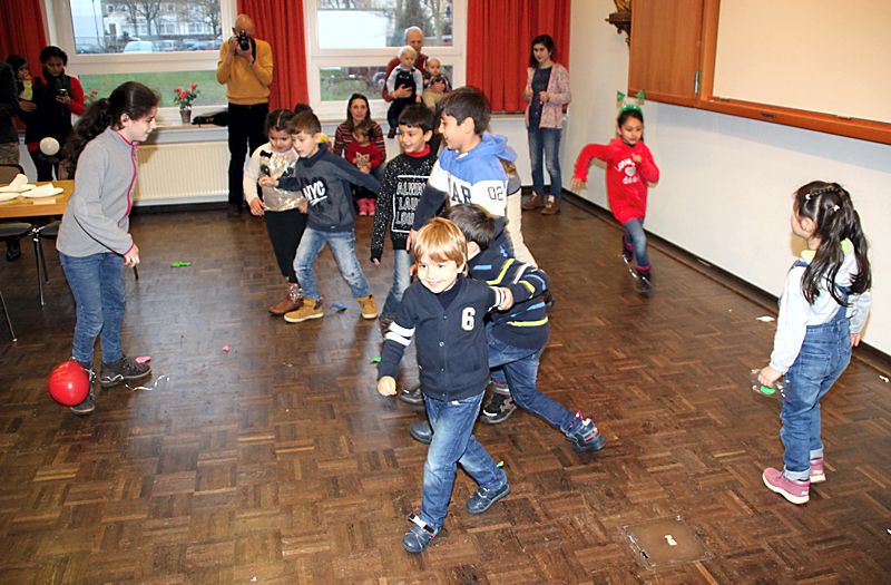 Eingeladen waren alle syrischen Mitbewohnerinnen und Mitbewohner sowie die Ehrenamtlichen vom Caritasverband. Gekommen waren über 50 Erwachsene und viele Kinder. Angefangenen hatte der Nachmittag mit einem Video „Rotkäppchen und der Wolf“. Zahlreiche Spiele waren vorbereitet, beim lustigen Luftballonspiel der Kinder mussten die an den Füßen befestigten Ballons während des Laufens zertreten werden. Das Kind, das zum Schluss noch den Ballon an den Füßen hatte, war der Sieger. Gemeinsam mit den Kindern spielten die Erwachsenen die beliebte Reise nach Jerusalem. Für das leibliche Wohl sorgten Deutsch-Syrische Spezialitäten, von Waffeln und vielen verschiedenen Salaten war alles als Buffet aufgetischt.