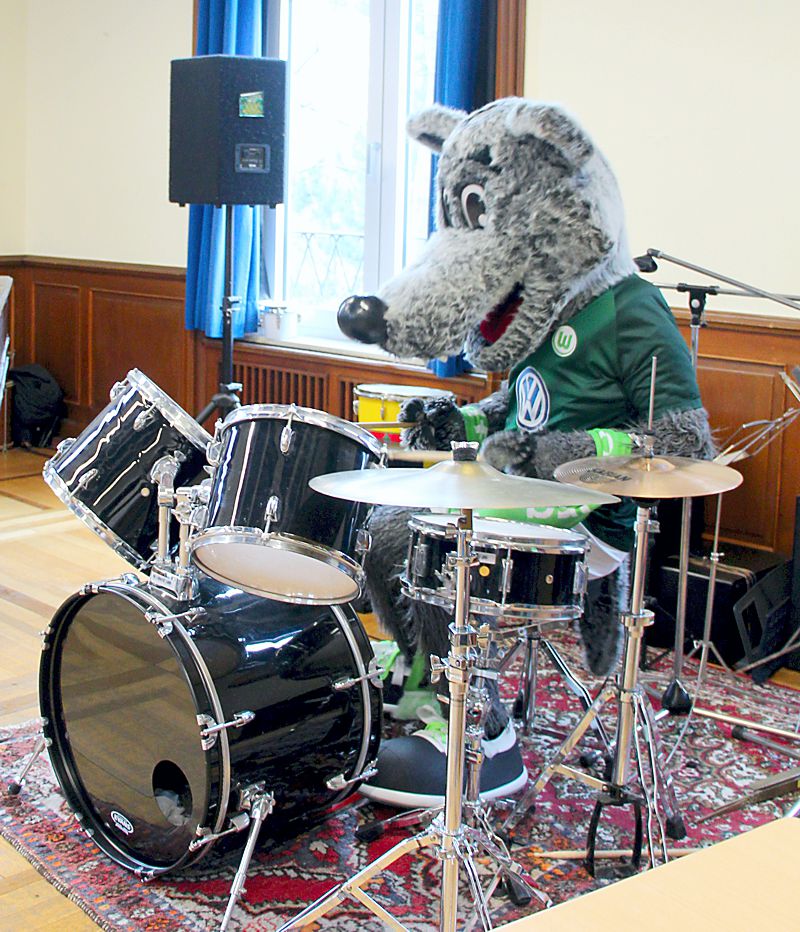 Wölfi, das Maskottchen vom Erstligisten der Fußball-Bundesliga VfL Wolfsburg, kam zu Besuch und brachte neben einer großen Urkunde, einem Trikot mit allen Original-Unterschriften der momentanen Mannschaft auch jede Menge Zeit mit.