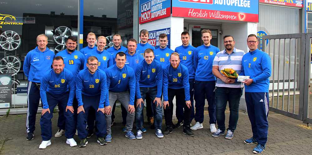Auf dem Betriebsgelände der AUTO-CHECK-ARZ Goslar GmbH, Kfz.-Handel und Werkstatt in der Okerstraße 45 in Vienenburg überreichte Geschäftsführer Özgür Göktay und Familie Gezer der Mannschaft die spendierten Sweat-Shirts. Mannschaftsführer Dennis Hunger bedankte sich im Namen der Mannschaft, Betreuer und Vorstand mit einem Blumenstrauß sowie einem Präsent bei Ötzi.